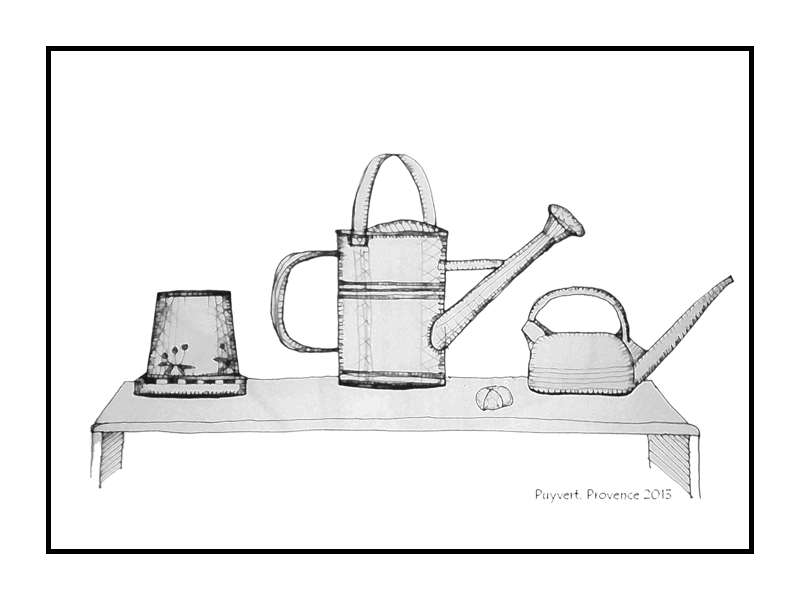 Sunny day in Provence, finally! I sat in the sun and drew some watering cans for my sketch of the day.
