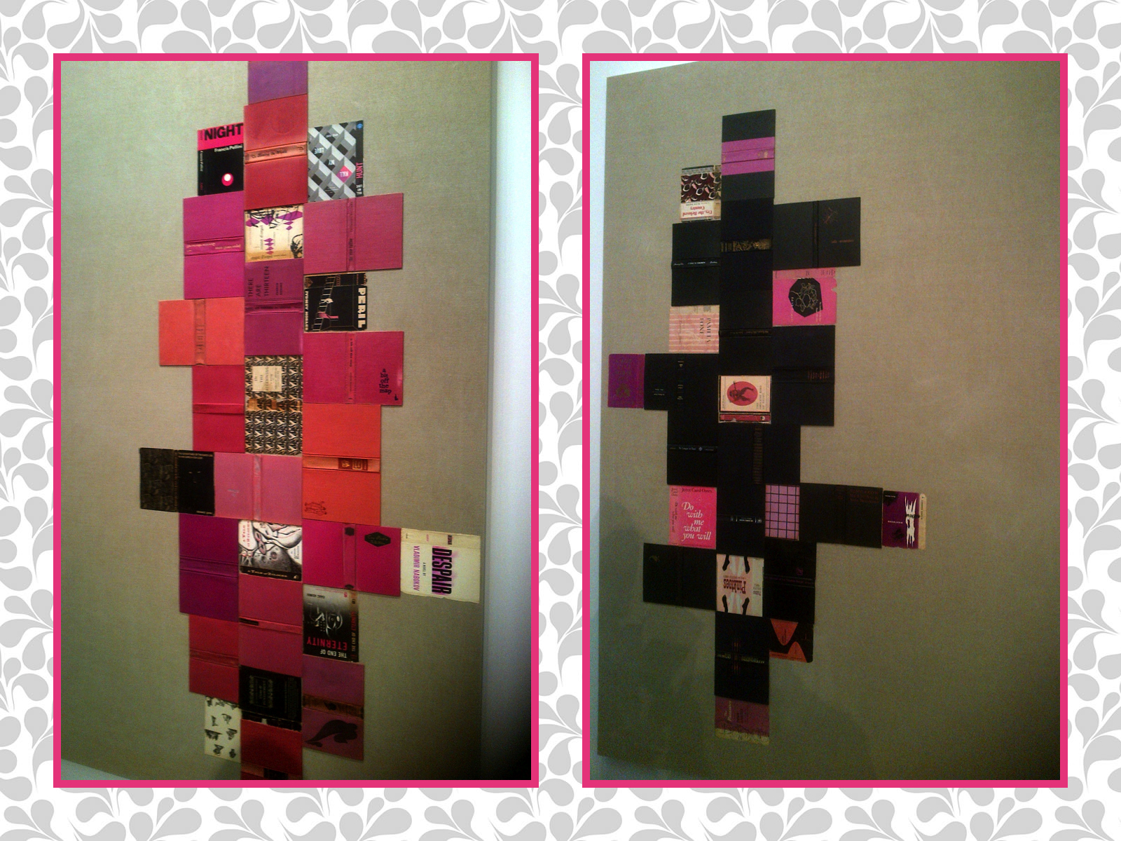 In the back room, another artist’s work is on display. Valeska Soares, Brazilian born, New York based. Her work is at first glance decorative, like an exercise in composition and colour. Discarded and found antique book dust jackets and covers are used as a collage in a geometric composition on unprimed linen canvas. As I look closer at the book titles, that’s when I’m drawn into the canvas, as I make sense of the text. There is no sense nor meaning, but my brain is constantly digging into my memory bank to make sense of the book references. I guess that’s part of the viewers artistic process.(?)