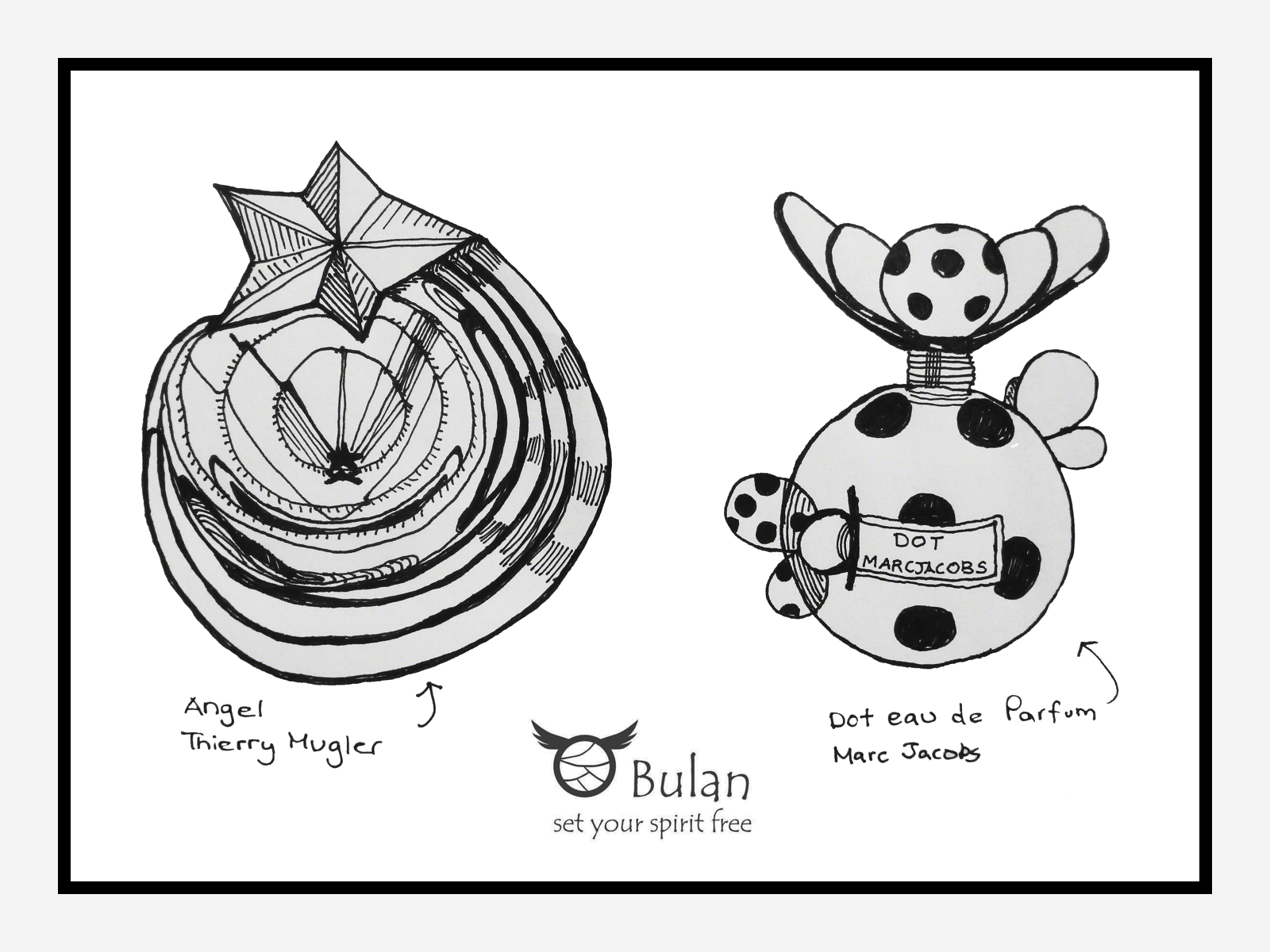 I had to sketch these last 2 for the series. They have been staring at me for ages now. I was getting a bit bored of drawing back to back bottles, but I have left it for long enough, and I thought if I didn’t, it wouldn’t be fair to the other bottles. These 2 are Angel by Thierry Mugler and Dot Eau de Parfum by Marc Jacobs.