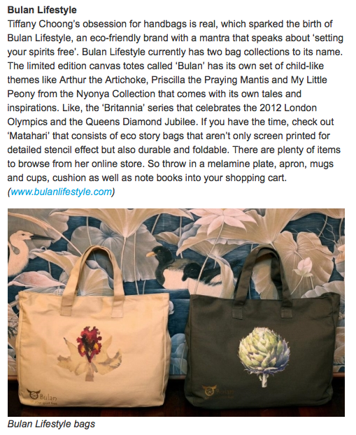 BulanLifestyle’s Odile the Orchid tote is featured in the guide under Penang Made Products and a write up in the online version. Click here to read the full article.