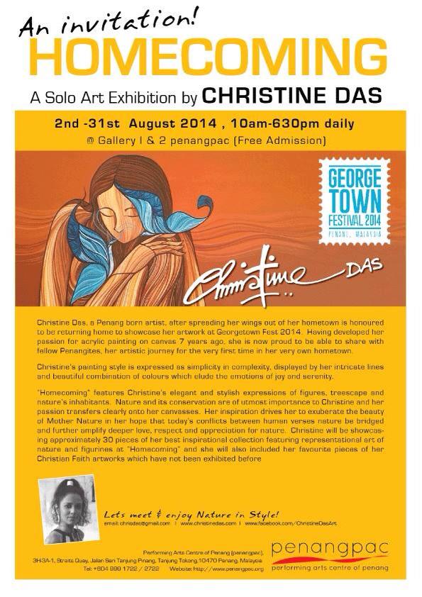 CHRISTINE DAS, a Penang born artist, after spreading her wings out of her hometown, returns home to share her artistic journey in her solo art exhibition, βHOMECOMINGβ.