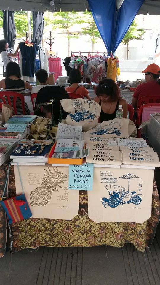My Friends and I decided to get a stall At Little Penang Street Market yesterday. We shared 2 tables between the 3 of us. It made it more fun as a group activity and less like a chore. It was the first time I was showcasing my new trishaw totes and the handmade cards.