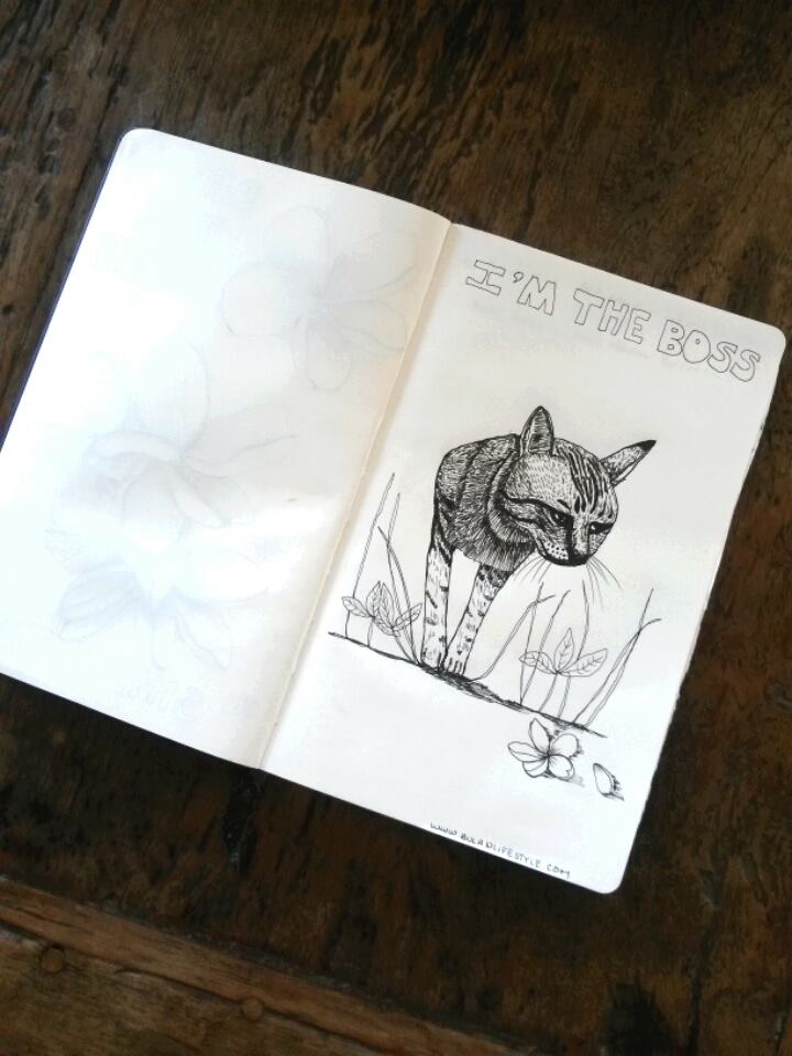 This is another sketch I did in my moleskine art journal in Uluwatu, Bali. This cat is my friend Ivy’s cat who is always up to something. He’s not really evil but like to scheme. He follows me into the kitchen and looks for food and attention. I guess he’s just being himself ;p