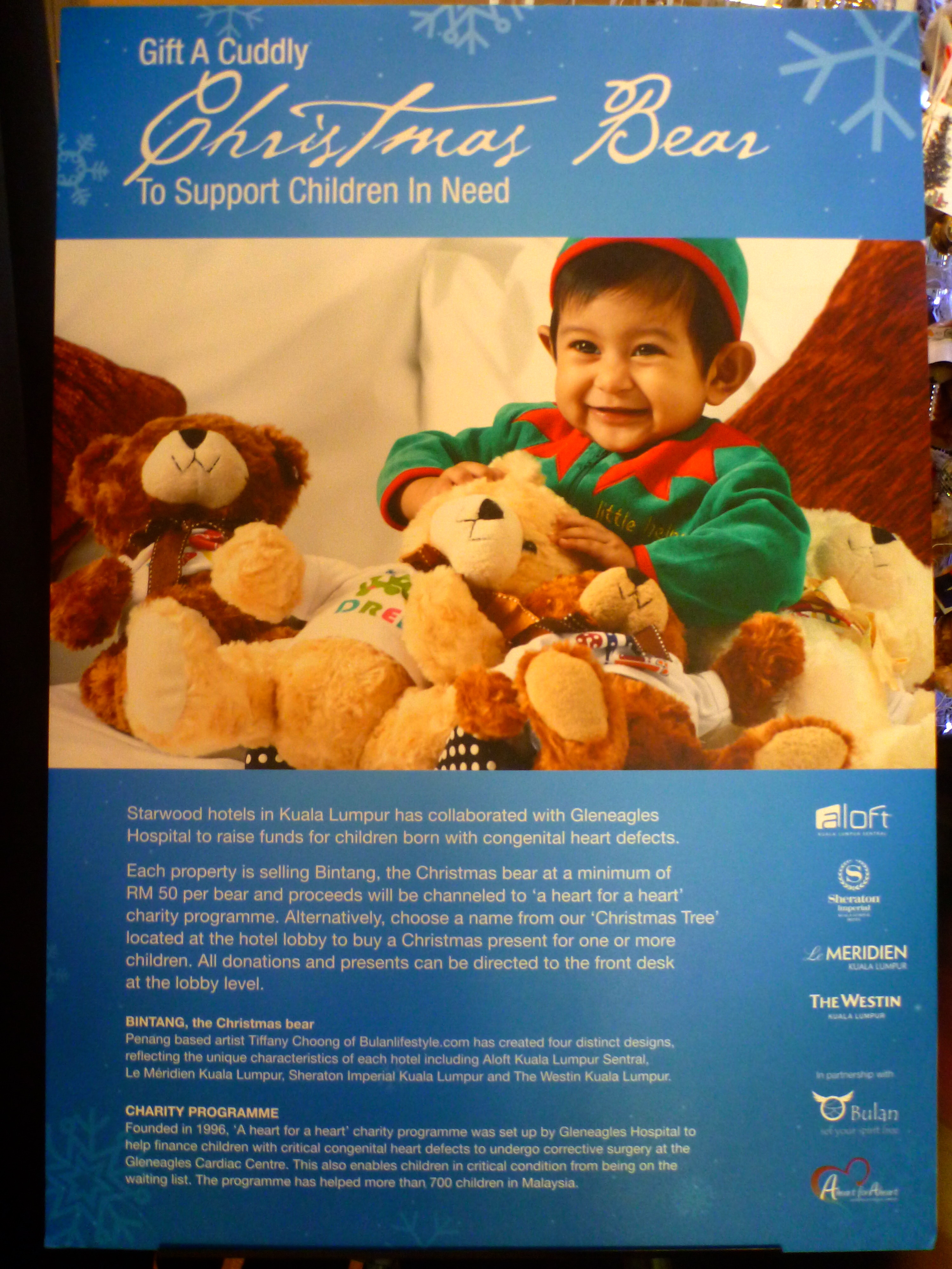 “Bintang” the Bear charity programme is launched today with a simple officiating ceremony at the HUB of Le Méridien Kuala Lumpur, by Chuck Abbott, together with all the General Managers of each of the four Starwood KL hotels. Children from the ‘heart for a heart’ programme, along with their parents and family members as well as Tiffany Choong of Bulanlifestyle.com are also invited to the mid-morning event.