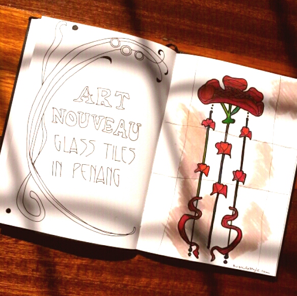 Sketch of the day is a vintage floral glass tile from the art nouveau period. These were used to decorate the exterior walls of a shop house in George town, Penang. There were many styles of tiles used ranging from Chinese, Nonya to English. The town is a eclectic mishmash of styles. There’s always something new to see.