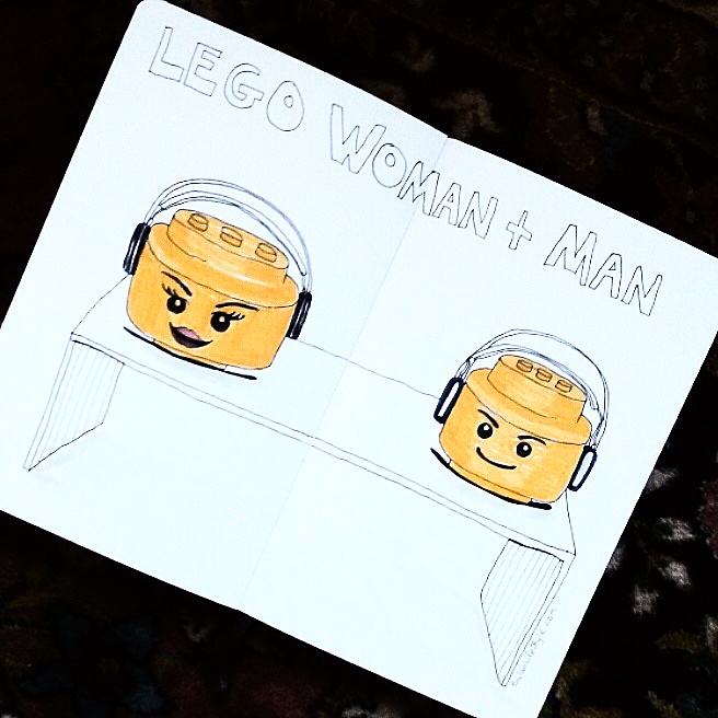 Sketch of the day in my moleskine art journal is a drawing of legoman and legowoman I spotted in Chamonix town window display for headsets.
