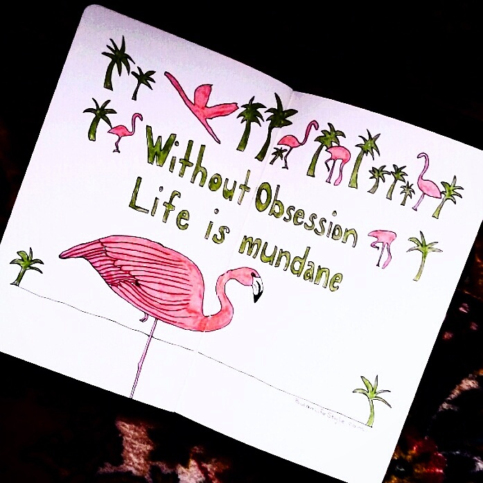 Sketch of the day in my moleskine art journal is a bunch of pink flamingos with the quote ‘without obsession life is mundane’ I found this pattern on my retro sunglasses strap. It’s so kitsch I love Pink Flamingos. Have a fun day x