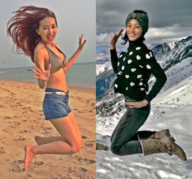 My friend Chelsia Ng and I choreographed this ‘Jump for joy’ photo for Uniqlo Malaysia. She is wearing blue demim shorts from Uniqlo and I am wearing Uniqlo Heat tech and Charcoal denim skinny Jeans. She is on the beach in Penang and I am at Aiguille du midi, Altitude 3000m in Chamonix, France.