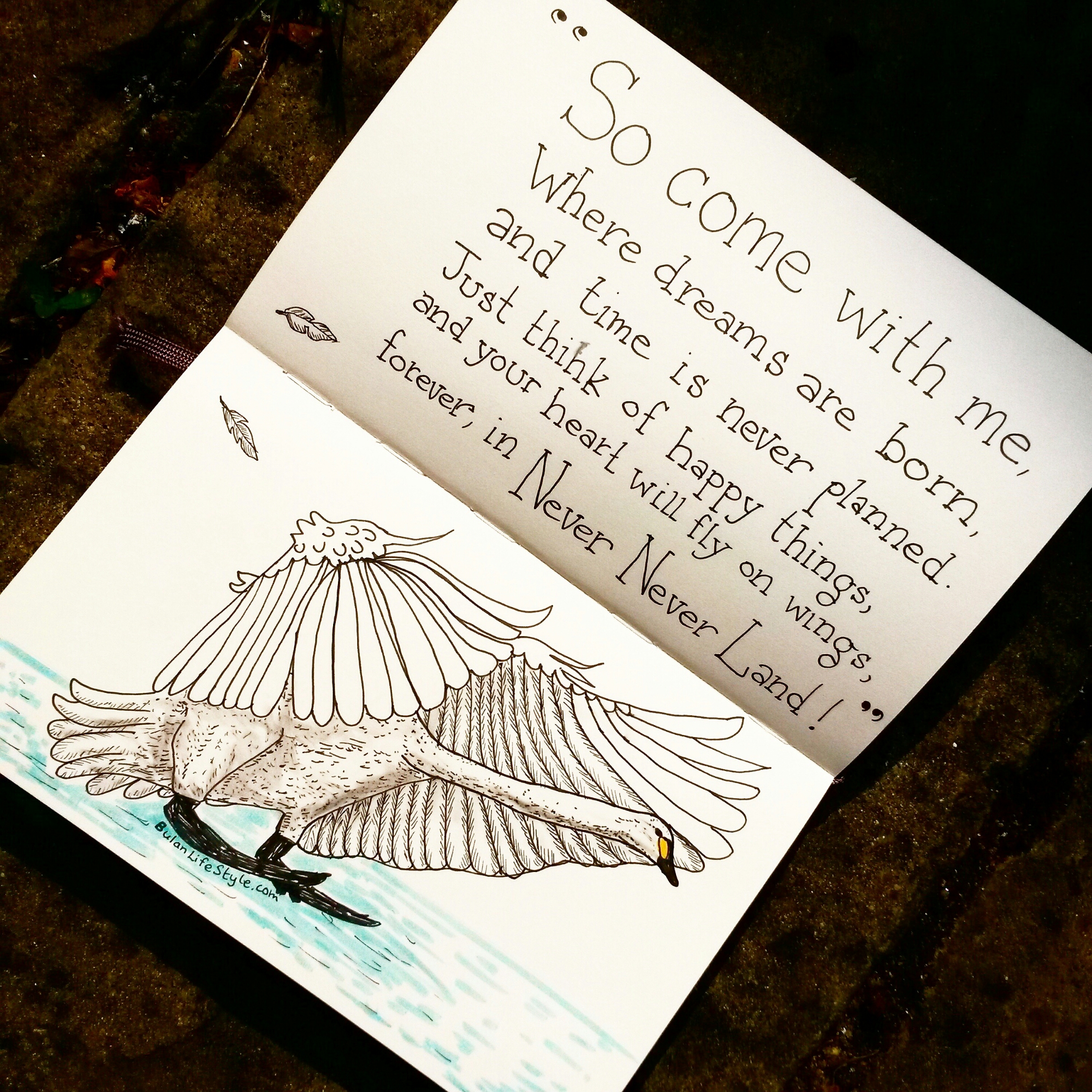 Sketch of the day no 569 in my moleskine art journal: Sylvia the Swan says “so come with me where dreams are born, and time is never planned. Just think of happy things and your heart will fly on wings, forever I’m Never Never Land” a quote from Peter Pan