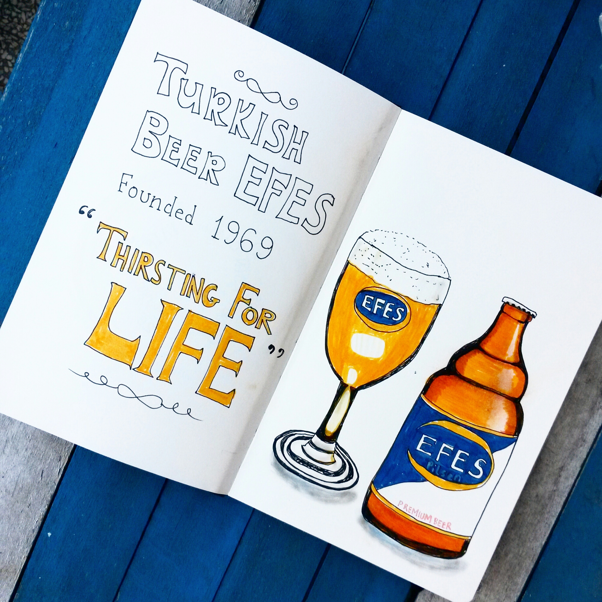 Sketch of the day in my moleskine art journal: Turkish beer Efes founded 1969. Their slogan is “thirsting for life”