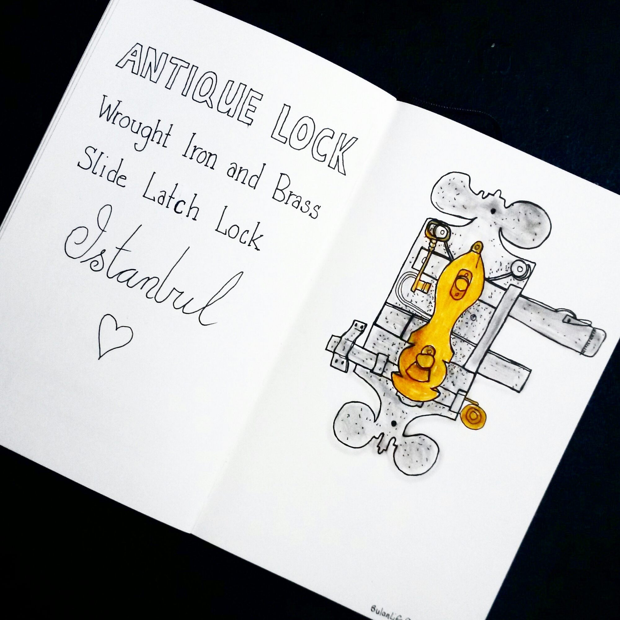 Sketch of the day in my moleskine istanbul art journal is an Antique lock made from Wrought iron and brass with a slide latch lock.