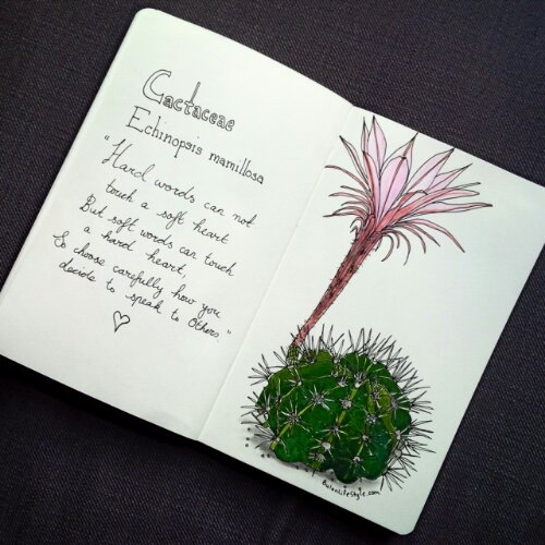 Today’s sketch of the day in my moleskine art journal is of a a botanical illustration of a pink lily cactus, Cactaceae Echinopsis mamillosa from Turkey.