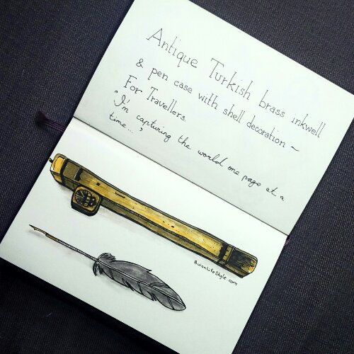 Sketch of the day in my moleskine art journal is of an antique Turkish brass inkwell & pen case with shell decoration for travellers.