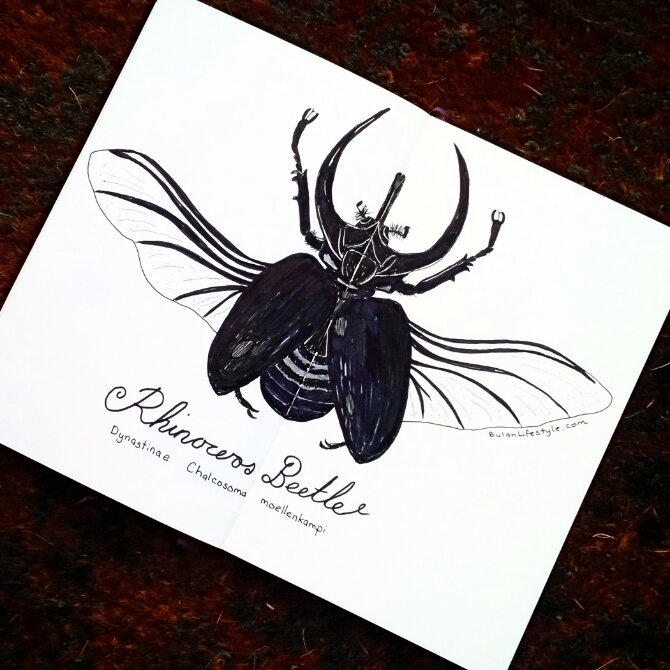 Today’s sketch of the day in my moleskine art journal is of a Giant rhino beetle. This beetle is one of my favourite beetles because of how it looks. As a child growing up in Penang, I used to see a lot of them in the garden. I havent seen one for a long time.