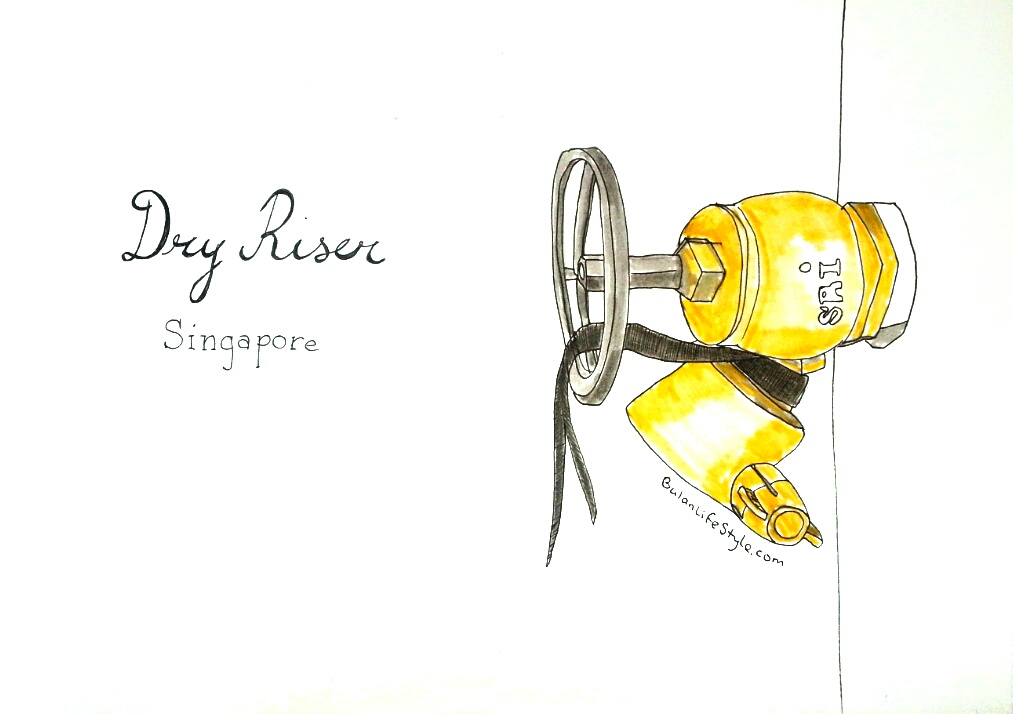 As im traveling this week, today’s Sketch of the day in my Daler Rowney art journal is of a retro looking yellow dry riser in Singapore which caught my eye outside an apartment.