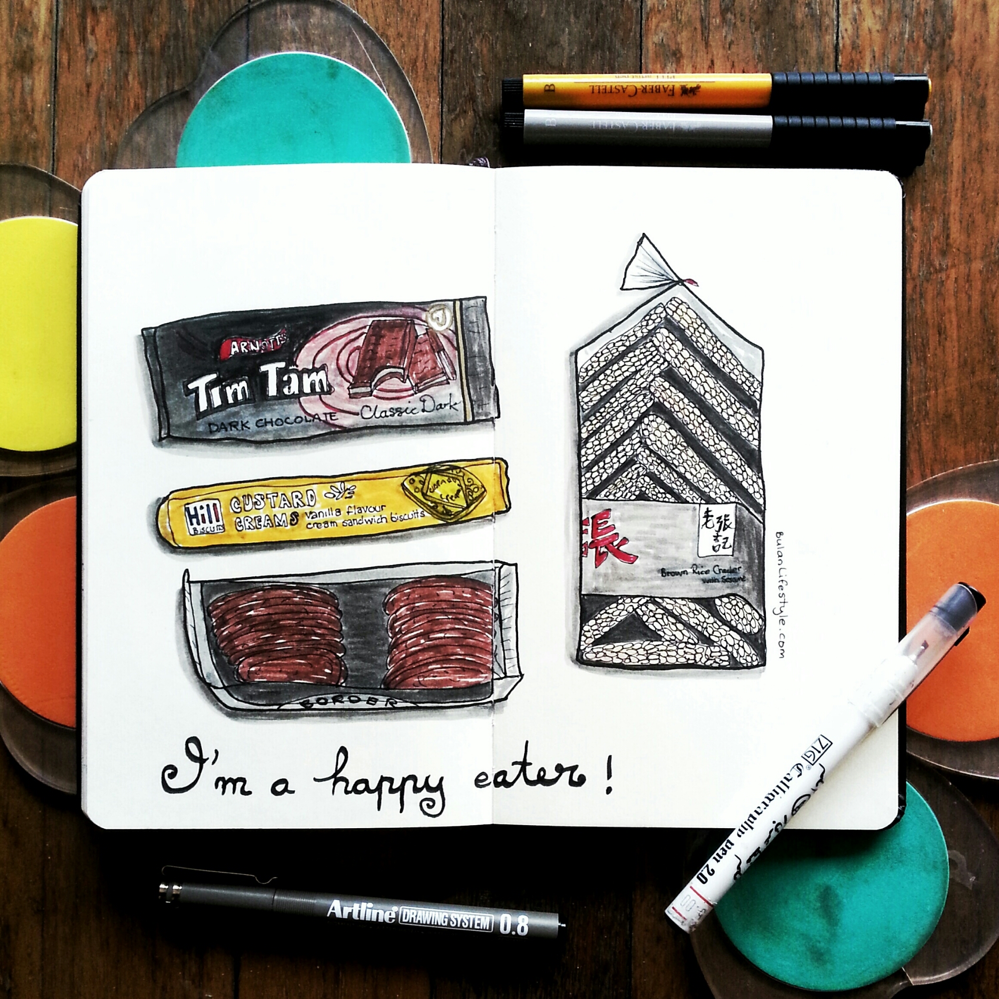 Happy Sunday. I’m a happy eater! Are you? Sketch of the day in my moleskine art journal are some assorted snacks for the weekend indulgence.