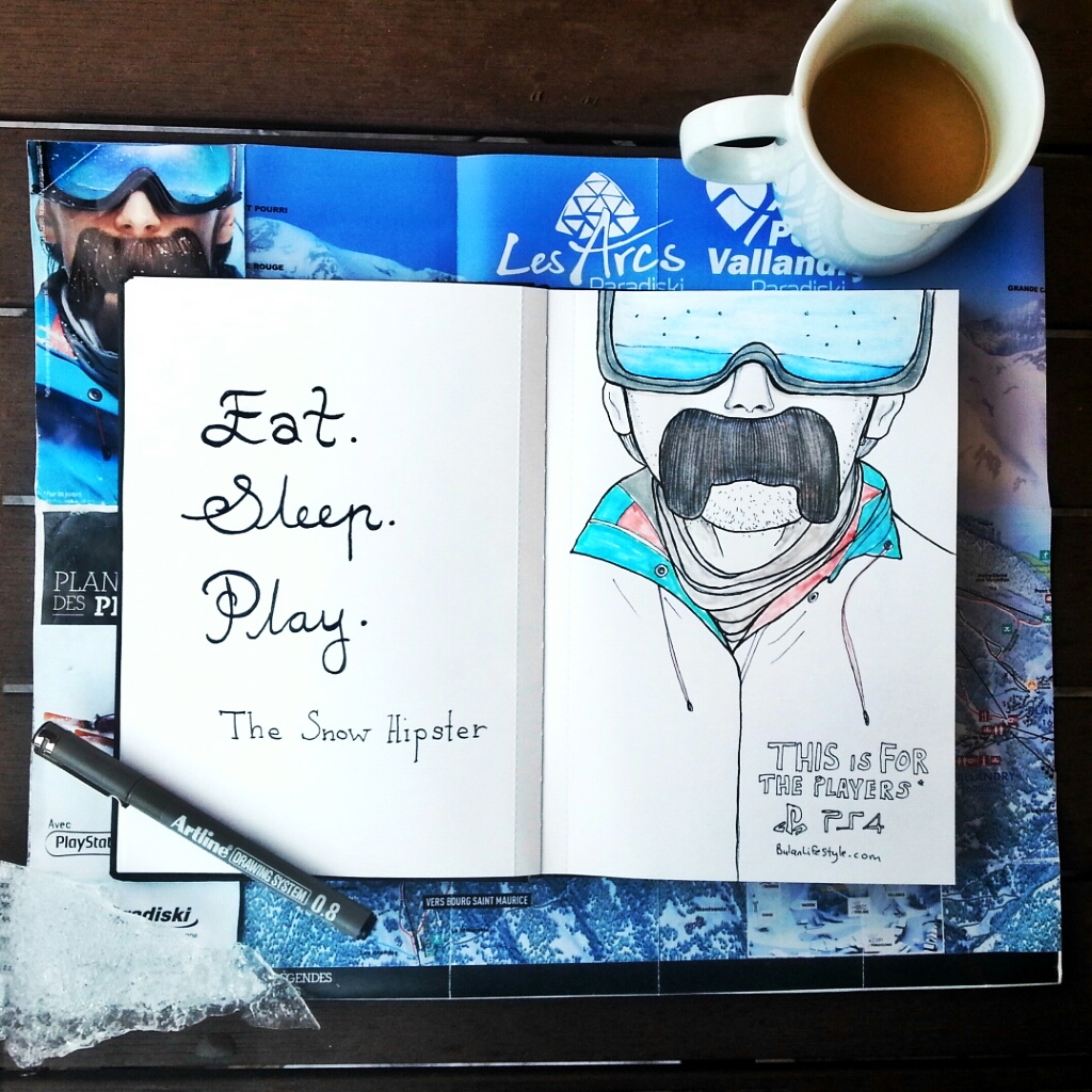 Sketch of the day in my art journal is The snow hipster. Eat. Sleep. Play. An advert for playstation which is on my Paradiski ski map.