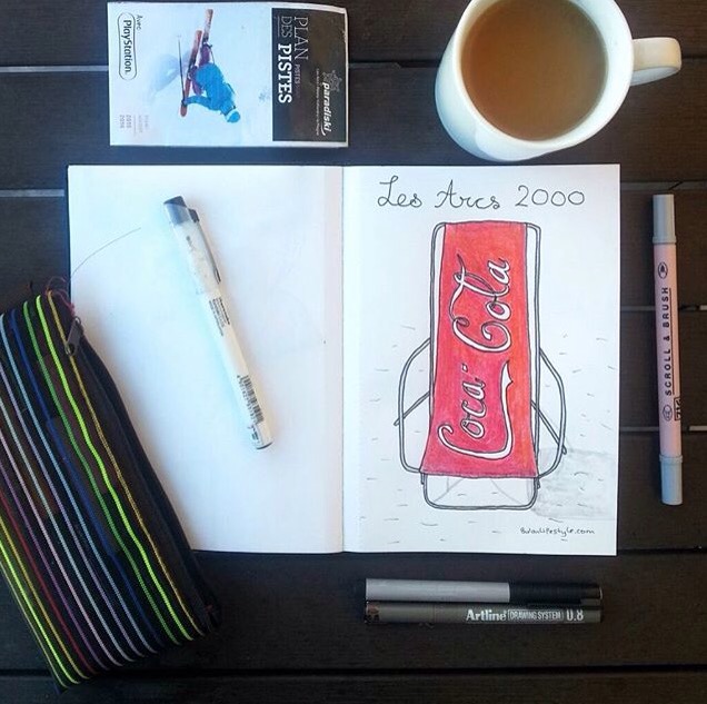 Bonjour! Sketch of the day in my art journal is a coca cola deck chair which is typical of Les Arcs, Paradiski, France. This is so good for resting between skiing.