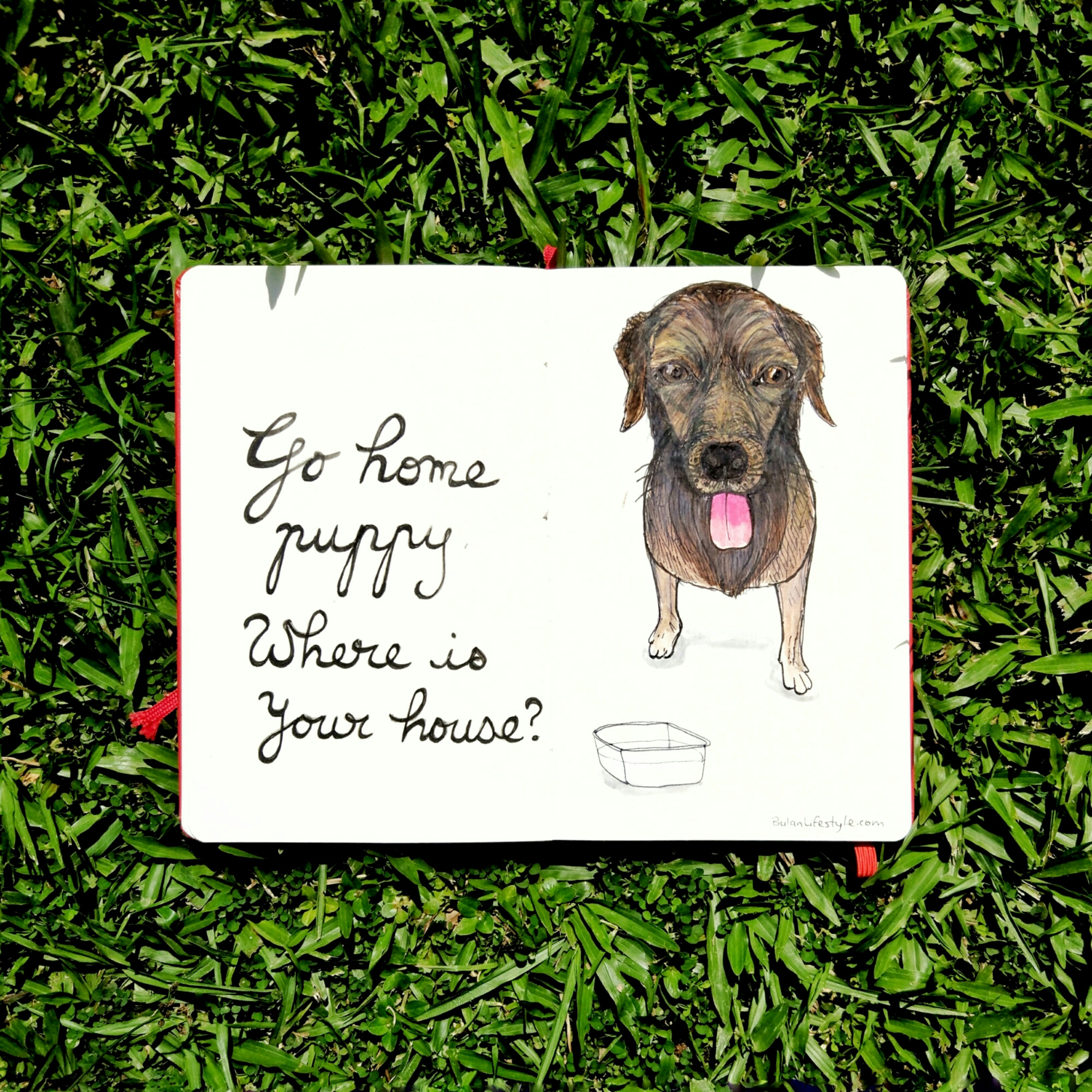 Go home puppy. Where is your house? Sketch of the day in my moleskine art journal is of a Golden retriever that appeared in the garden during a thunderstorm. I found out the next day that she belongs to the neighbour. ๐ถ