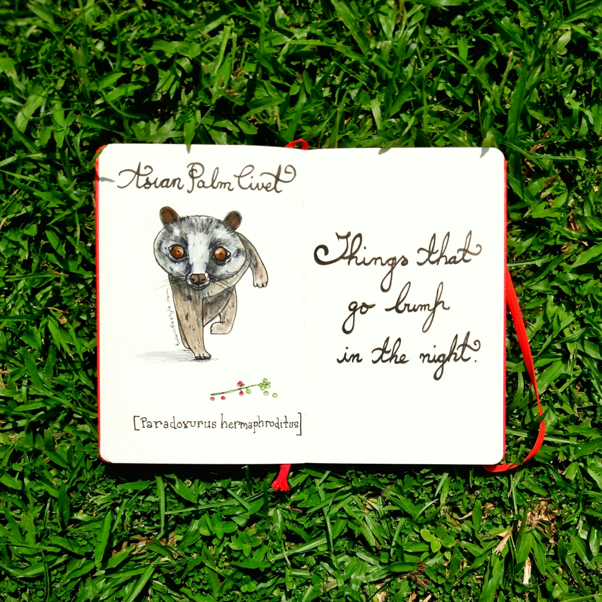 Things that go bump in the night. Sketch of the day no 1000 in my moleskine art journal is of an Asian Palm Civet that lives in my attic. 🐱
