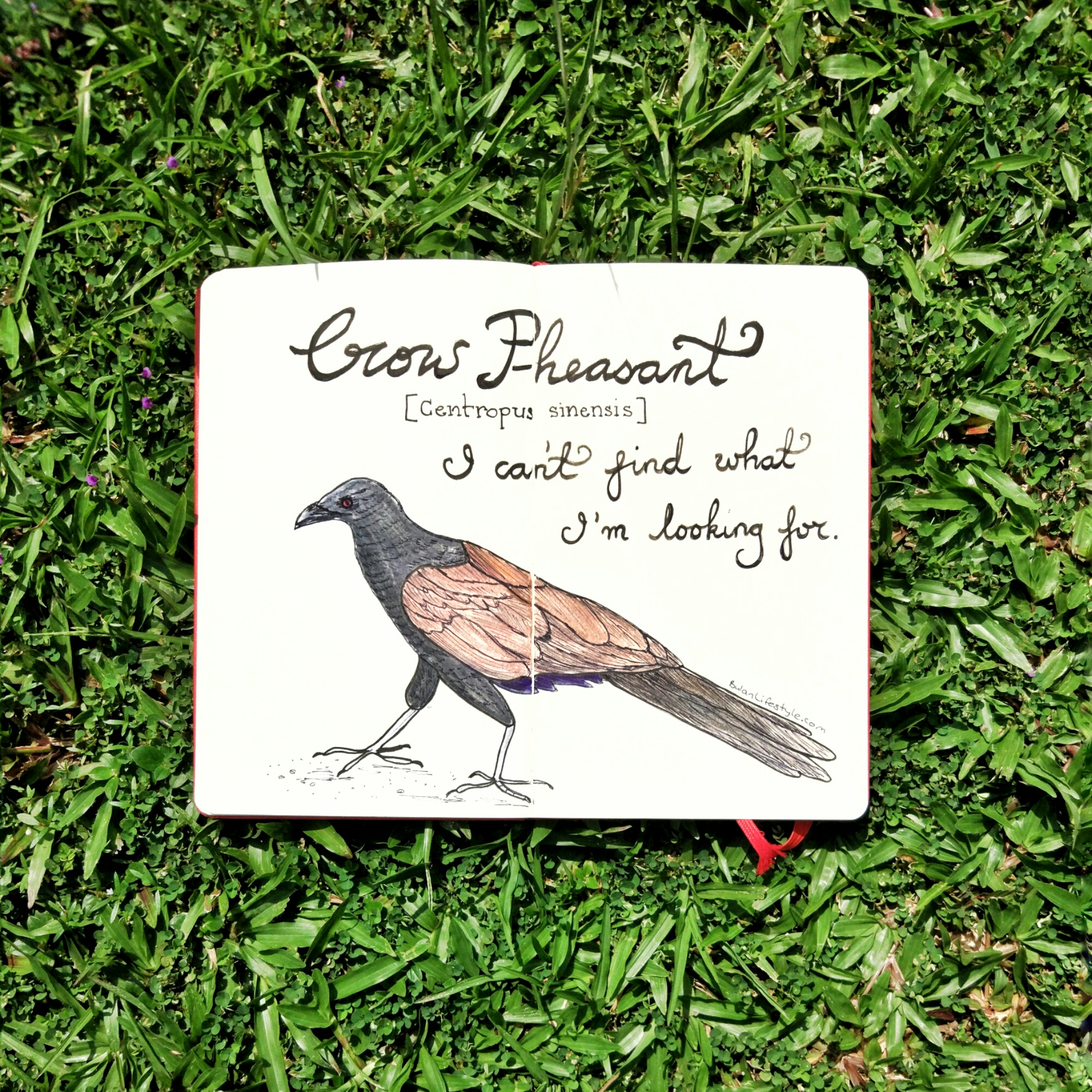 I can’t find what I’m looking for. Sketch of the day in my moleskine art journal is of a Crow pheasant foraging in the garden.