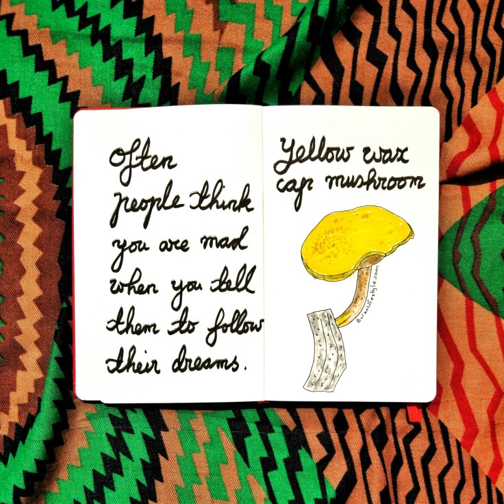Sketch of the day no in my moleskine art journal is of a pretty bright pyellow cap mushroom I discovered on my jungle trek in taman rimba, Penang.