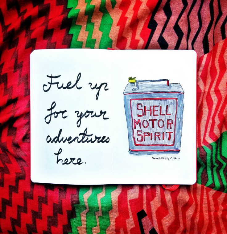Fuel up for your adventures here. Sketch of the day in my moleskine art journal is of a vintage Shell motor oil can from a car boot sale in London.