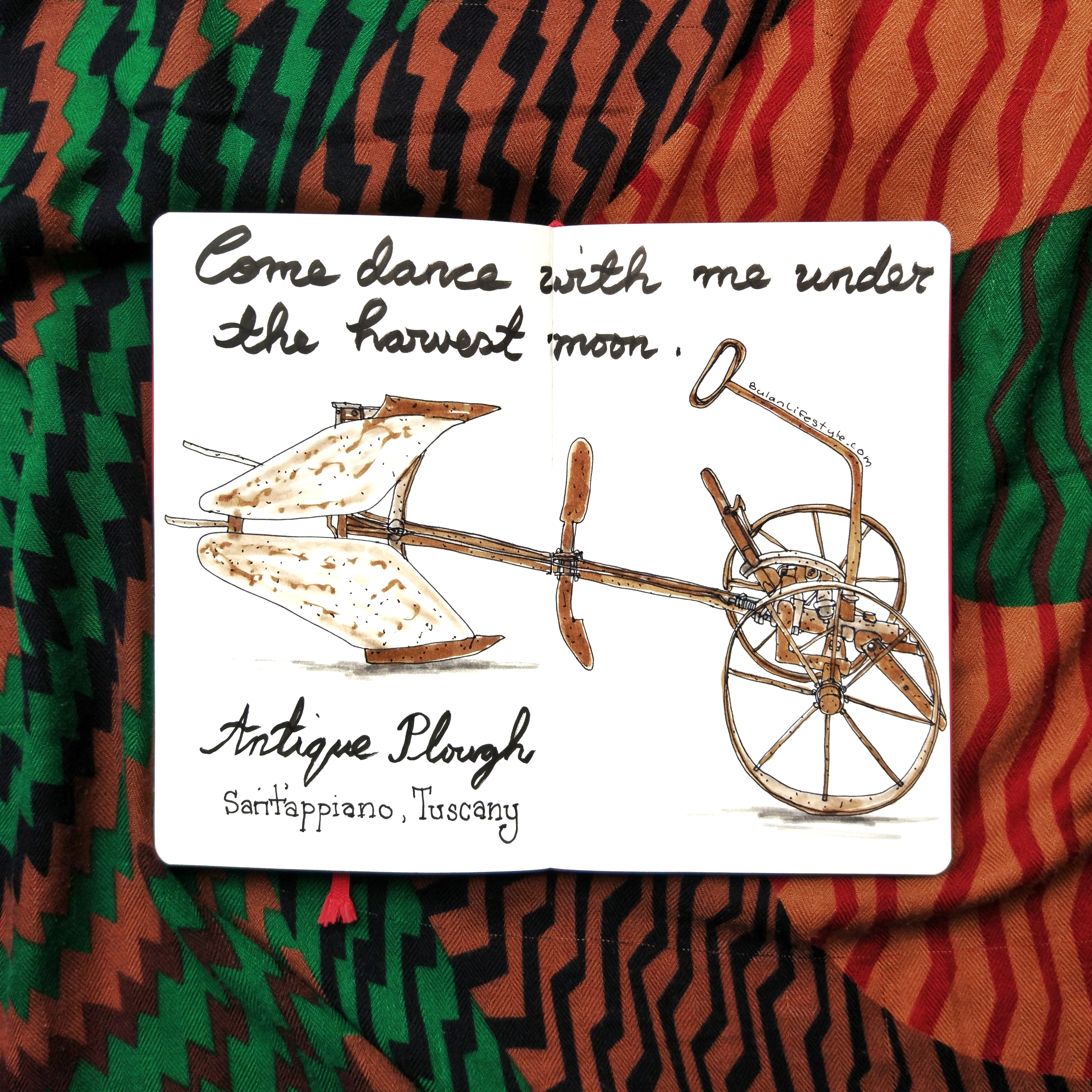Come dance with me under the harvest moon. Sketch of the day in my moleskine art journal is of an antique plough i spotted in the Sant’Appiano wine Estate in Tuscany.