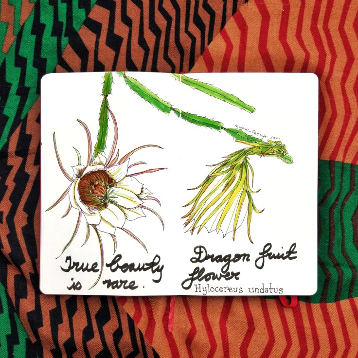 Sketch of the day in my moleskine art journal is of a Dragon fruit flower which was blooming in the garden. It is also known as a night bloomer. The flowers open at night and lasts for one day. The next morning it starts to wilt.