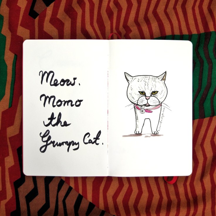 Meow says momo the grumpy cat. Sketch of the day in my moleskine art journal is of Momo the Grumpy cat I met in Penang.