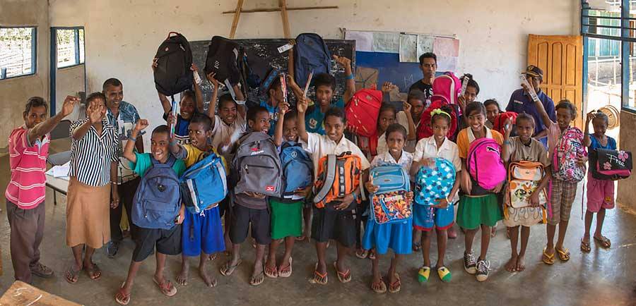 On the day of our visit there where 85 students present. All received Kits-4-Kids bags.The Vega team had prepared special supplies bags for the teachers. 2 large boxes with general school supplies and footballs which where handed over to the head mistress. This year we had volunteers from the East Timor Maritime Police and Customs helping with the schools visits. The Kits-4-Kids Schoolbags were donated by students from the GESS German European School Singapore and students from Penang Malaysia. School-supplies were donated by Montessori kindergarten, Uplands, Dalat and CGL international schools and Tinker Bell couture Penang. Many thanks also to all the individuals who contributed, especially the nice folks in Singapore and Penang, Malaysia. As always if you like what we are doing please do share these pics with your friends.” ~Historical Vessel Vega