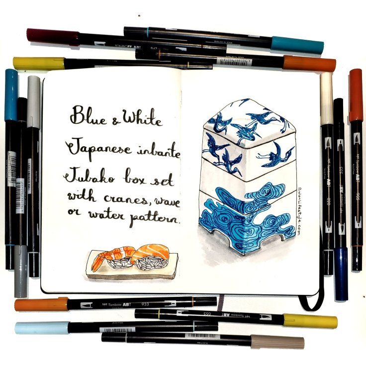 Sketch of the day no 1297 in my moleskine sketchbook is of a blue and white Japanese inbante Jubako box set with cranes, waves or watter patterns and a couple of sushi.