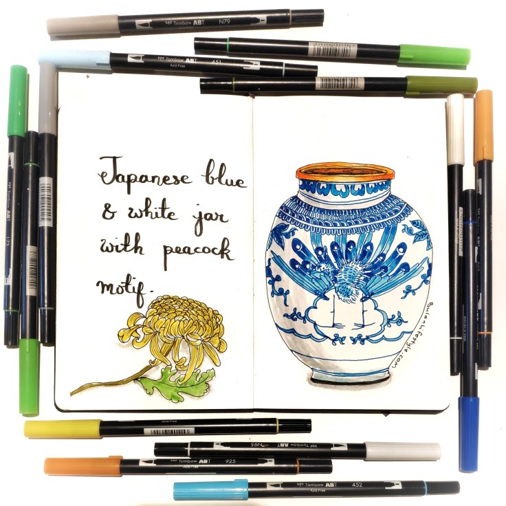 Sketch of the day no 1299 in my moleskine sketchbook is of a l Blue and white Japanese porcelain jar with peacock motif and chrysanthemum flower.