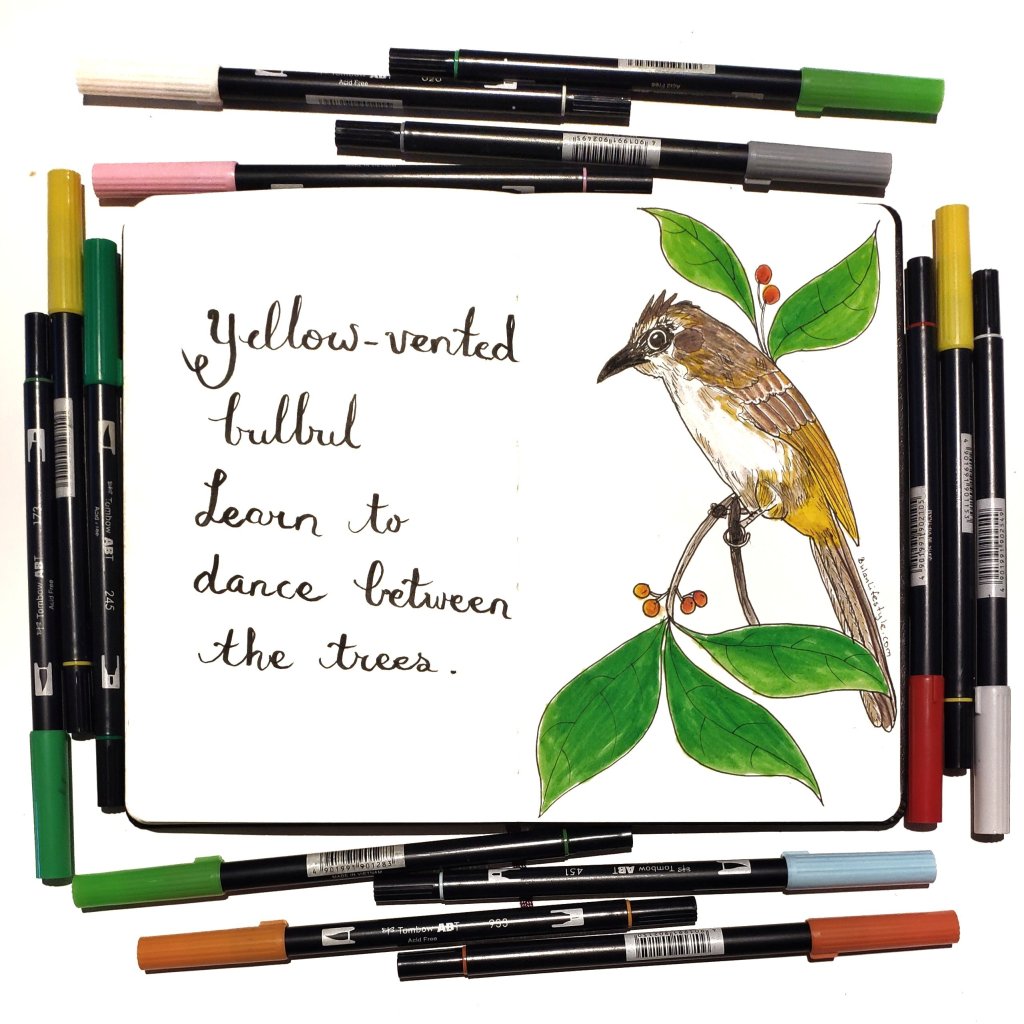 Sketch of the day no 1326 in my moleskine sketchbook is of Barry the yellow vented bulbul who loves to dance between the trees.