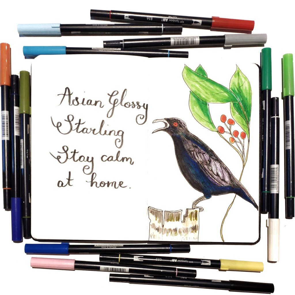 Sketch of the day no 1327 in my moleskine sketchbook is of Stanley the Asian Glossy Starling. Ive been birdwatching from my balcony in Malaysia since we cannot go anyway. The city has been very peaceful and the birds are enjoying life without humans getting in the way. I have never seen so many birds from my balcony before. They really keep me company and bring me joy.