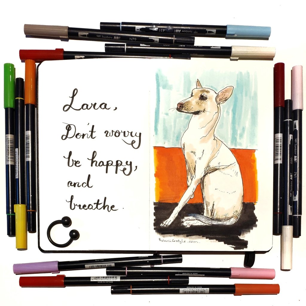 Sketch of the day no 1330 in my moleskine sketchbook is of my friend’s dog Lara who always holds her breath, worries about everything and is afraid of her own shadow.