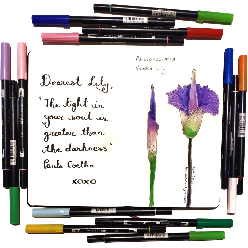 Sketch of the day no 1352 in my moleskine sketchbook : Voodoo Lily, a flower that smells like death in order to protect it’s being. This is for my bestie Lily who is full of life, quirky ideas and unafraid to get her hands dirty to get right to the core of life. We’ve had some fun adventures exploring creepy back lanes in our home town to picnicking on the banks of Basel. Thank you for your fierce loyalty and integrity. Love you lily β€οΈ