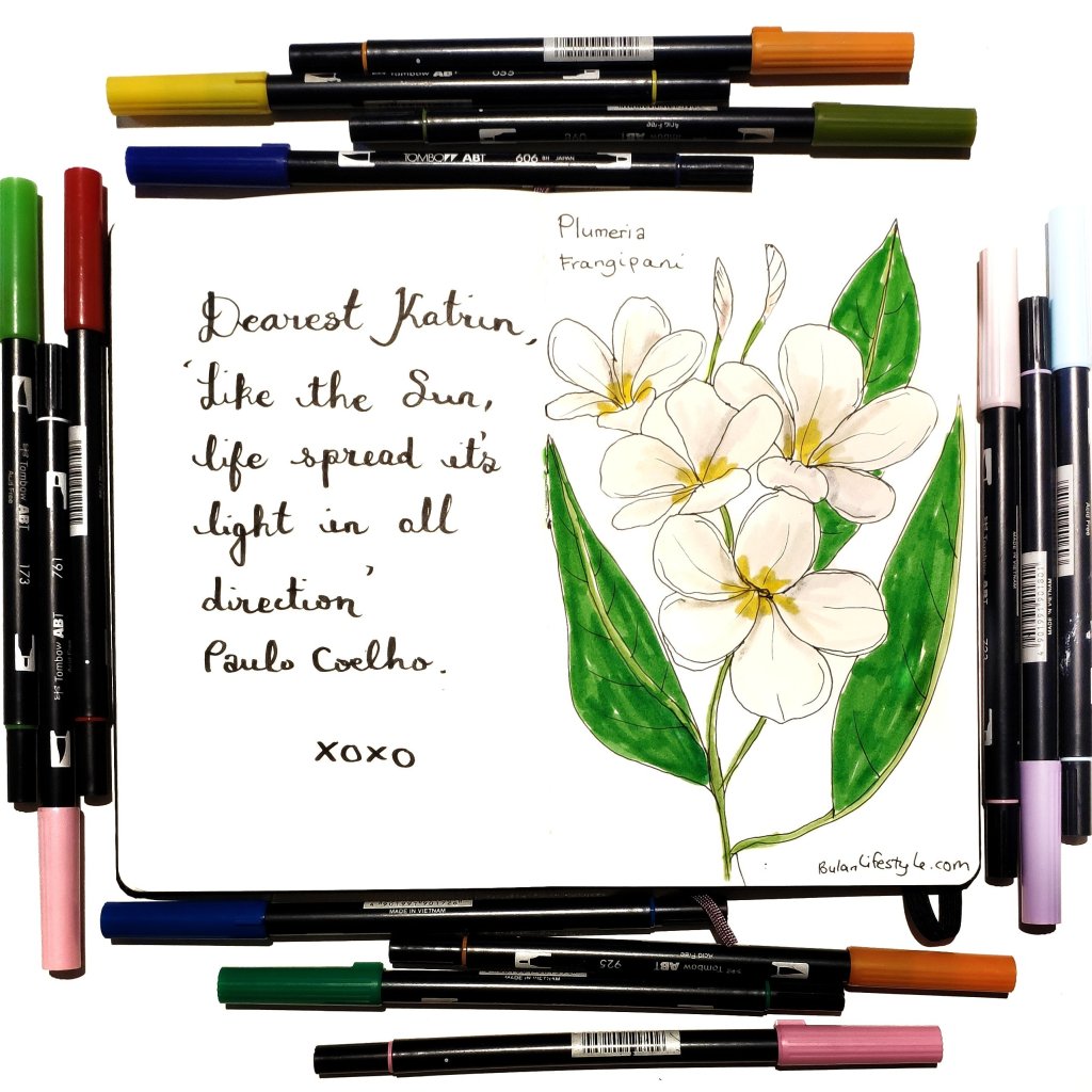 Sketch of the day no 1357 in my moleskine sketchbook: Frangipani flowers for my gorgeous and talented childhood friend Katrin Forster