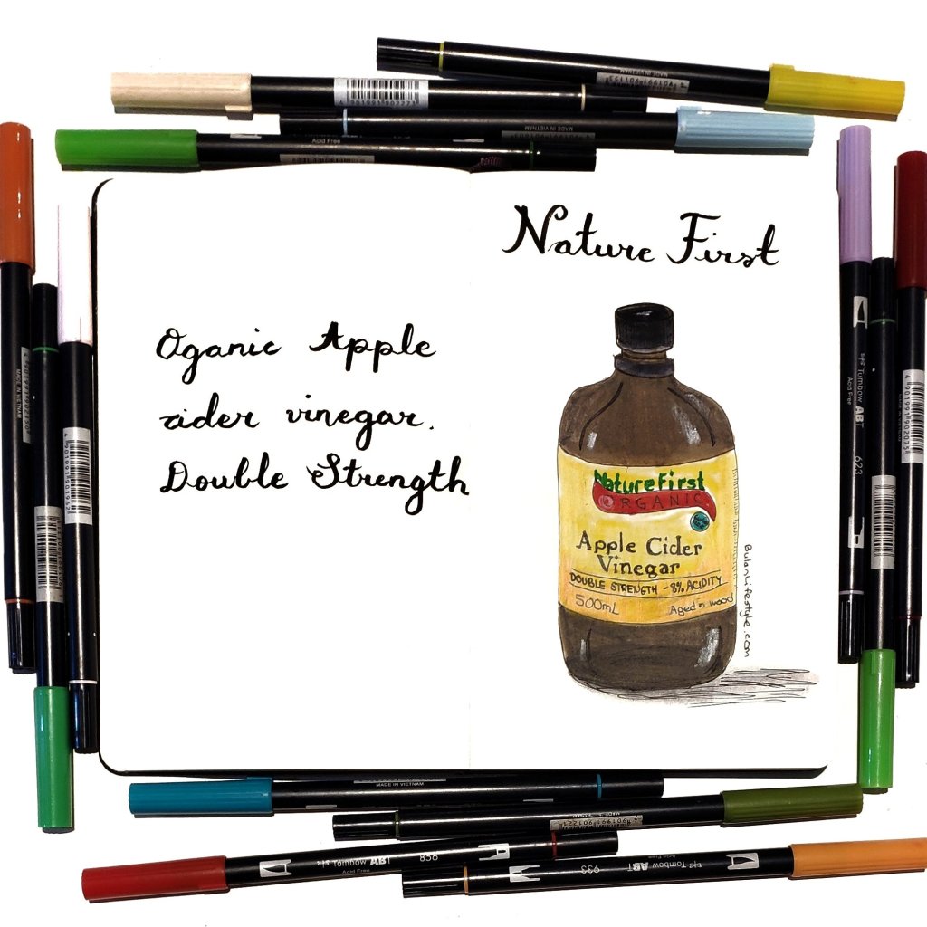 Essentials from my kitchen.Sketch of the day no 1387 in my moleskine sketchbook is of a bottle of apple cider vinegar