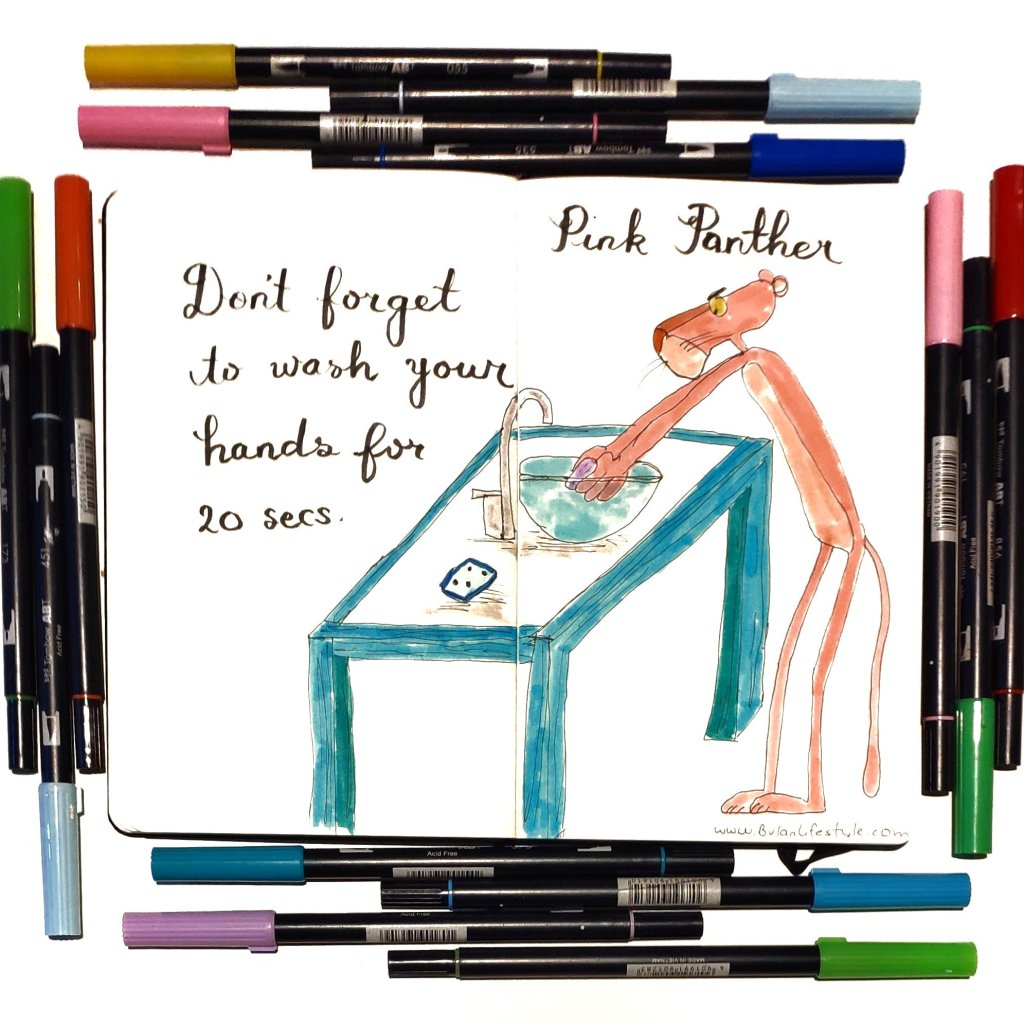 Sketch of the day no 1405 in my moleskine sketchbook is of the Pink Panther washing his hands