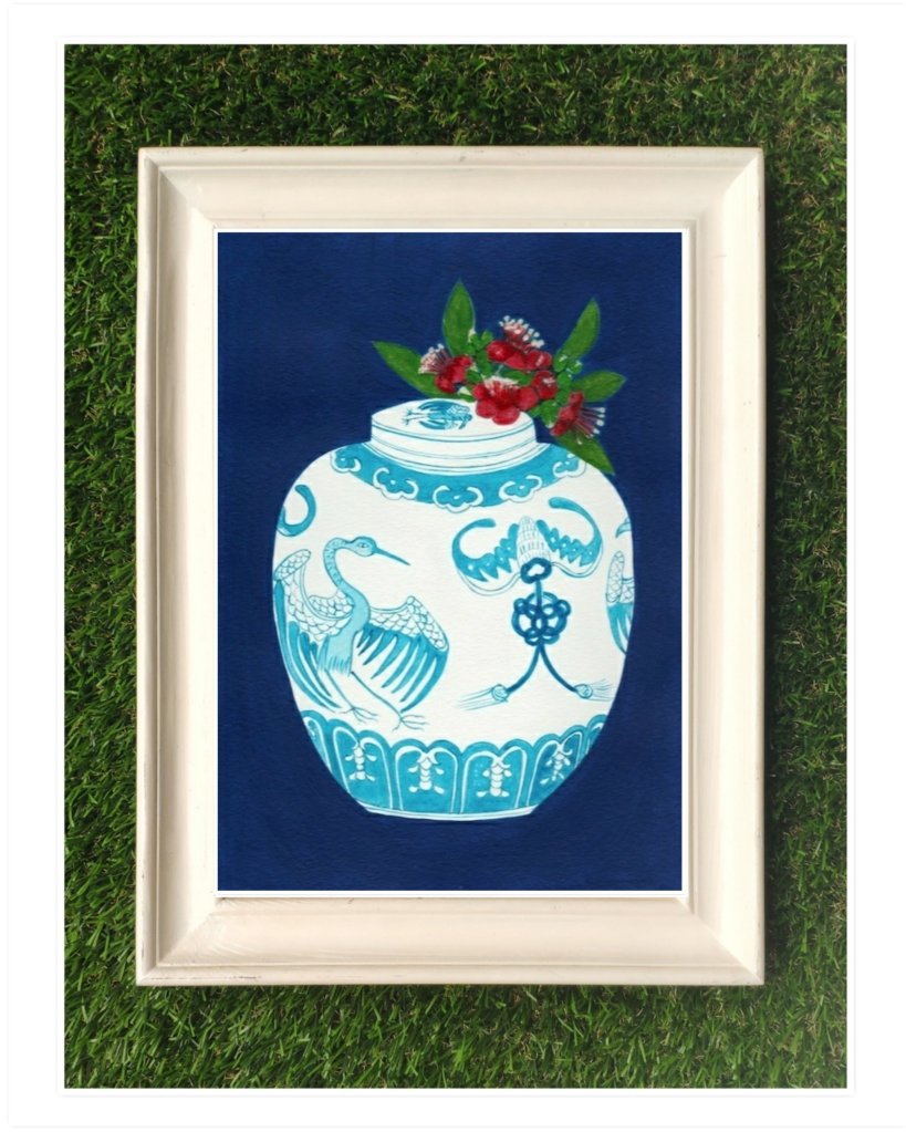 Traditional Blue and white Chinese porcelaine jars were used to carry spices like ginger. In this painting, I have matched the fragrant Durian flower with this ginger jar because of the crane and bat motifs on the design. Bats are the main pollinators of the durian flower and the King of fruits is native to Malaysia.