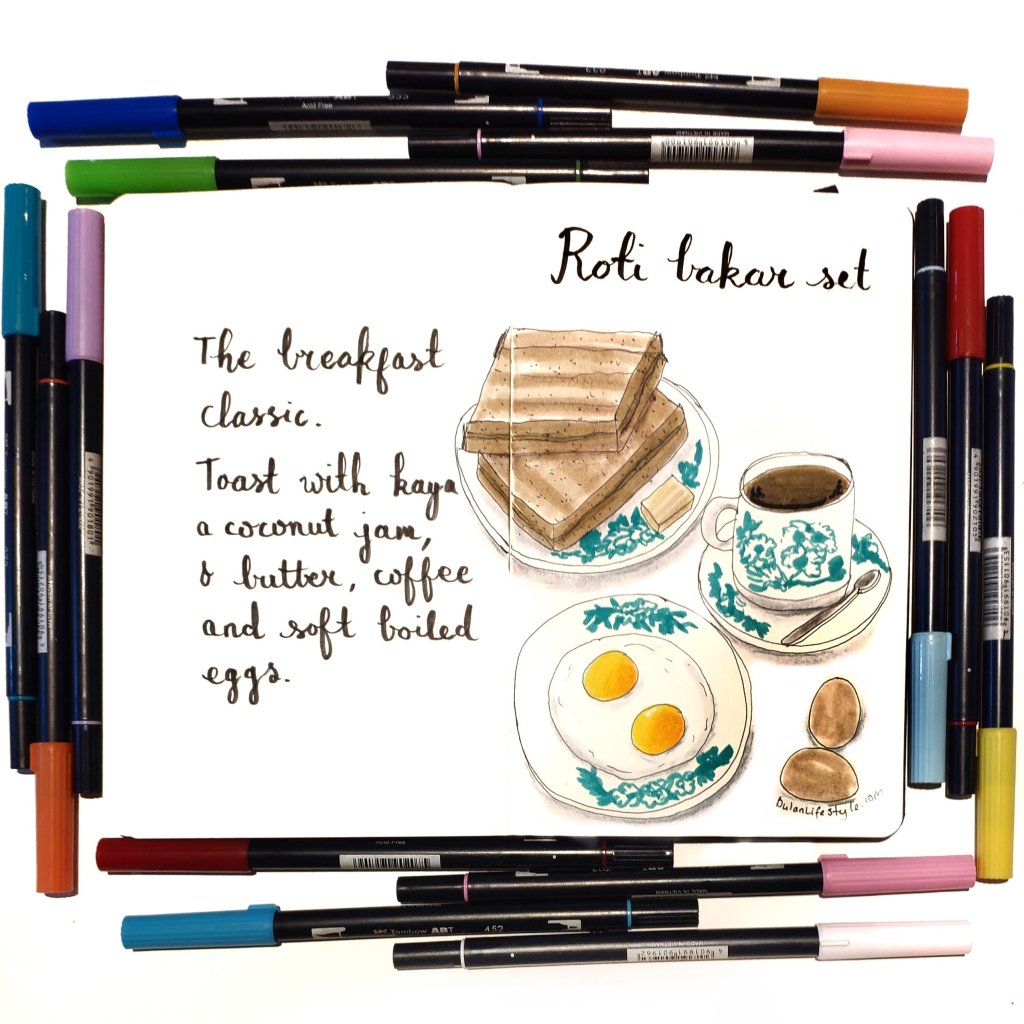 Today’s Sketch no 1421: Roti Bakar set. A breakfast classic consisting of toast with coconut jam and butter, soft boiled eggs and coffee.