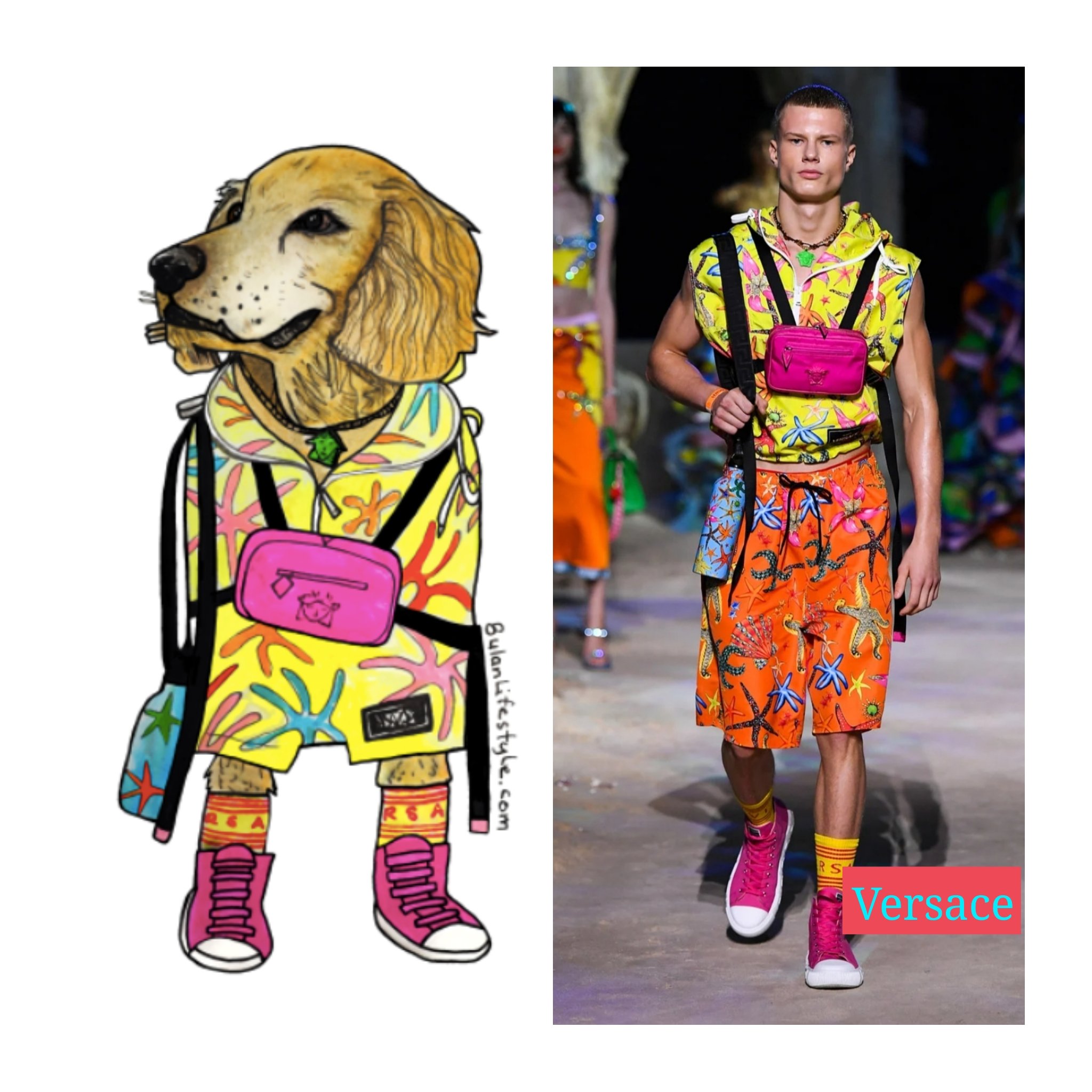 Sketch of the day no 1505 in my moleskine sketchbook is of Max the golden retriever pet portrait fashion makeover styled in Versace SS21