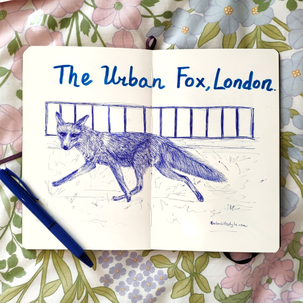 How to stay motivated? Consistently draw and make it a habit. Drawing of an urban fox in my moleskine sketchbook using a blue biro pen