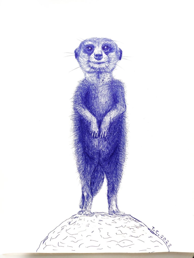 Blue biro Pen drawing of Meerkat from my London zoo visit.