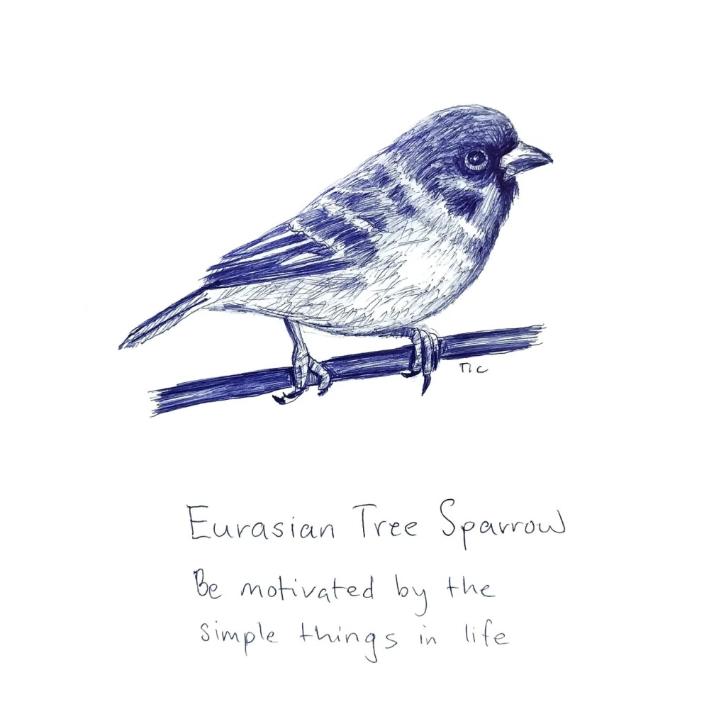 Keeping it simple with a biro sketch of an Eurasian tree sparrow. It’s currently building a nest in the window.