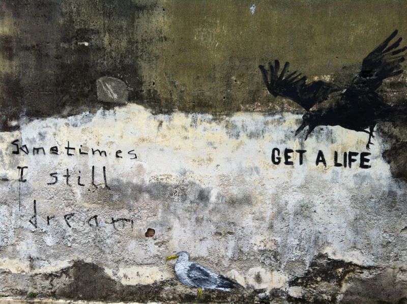 After a long absence, Stewart the seagull is back, and the crow is dead. The original Street art was painted over by another giant mural.