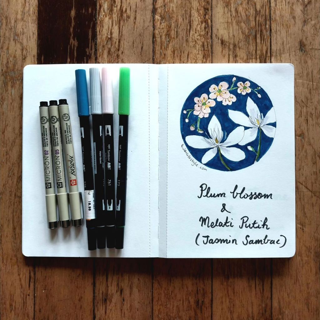 Sketch of the day Plum blossom and Melati putih flowers (Jasmin Sambac).