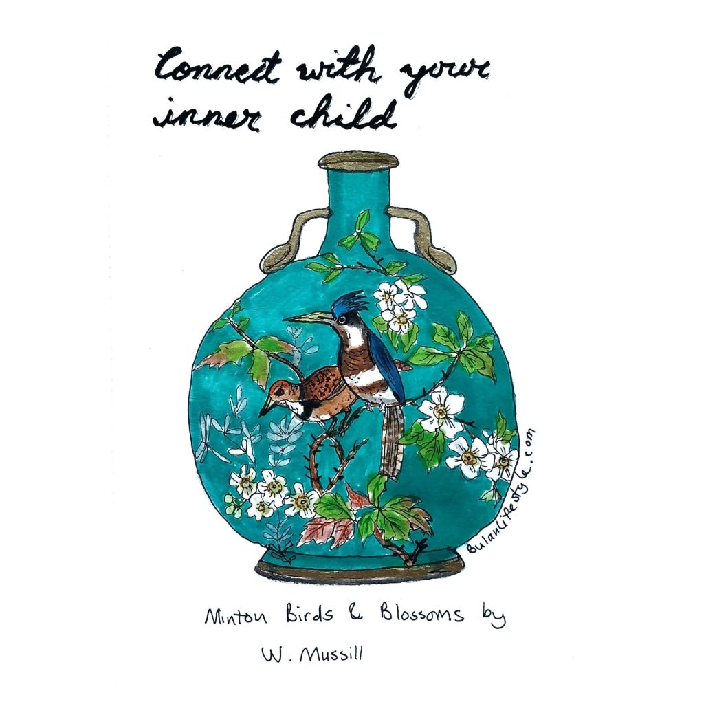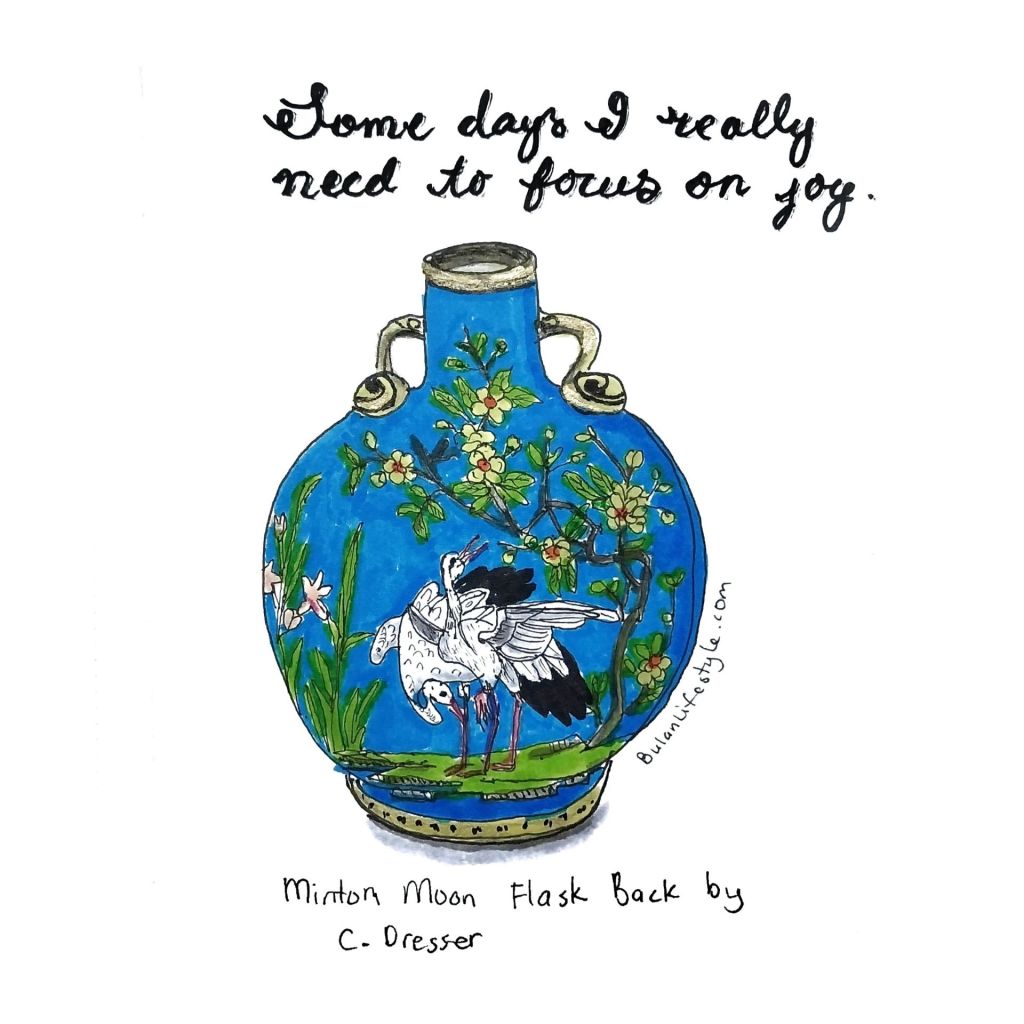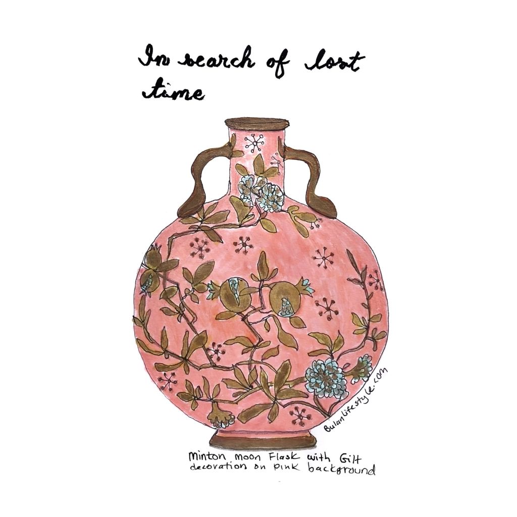 I have been obsessed with these moon flasks. Firstly because they are so pretty, but also because of the name moon flask. They are called moon flasks because of the round shape. Moon flasks were originally made to carry wine for travellers which is another reason I find them fascinating. They seem to tick all the boxes for things I would love. These colourful Minton moon flasks were made to be decorative for homes. I would love to own one but the next best thing is drawing one and keeping it in my sketchbook until I turn them into large paintings. My sketchbook is where I keep ideas and a it works like a catalogue of things I love to develop into larger paintings.