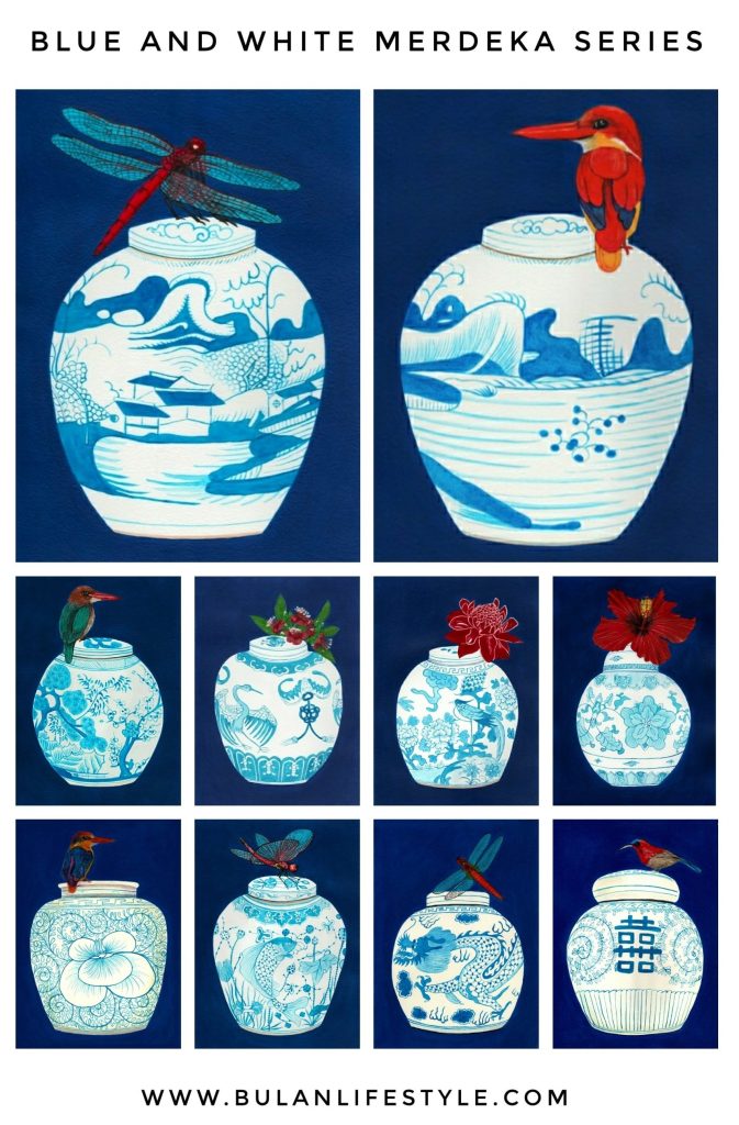 Chinese Blue and White Ginger Jars with Malaysian Wildlife on a dark blue background representing the starting point, and then on neon background representing the evolution. The Chinese blue and white porcelain jars, symbolizes the roots and heritage of the Chinese diaspora, the legacy of traditional Chinese culture, the porcelain jars stand as silent witnesses to the artist’s ancestral heritage. These jars represent the artist’s inherited aspects of Chinese traditions and history, serving as a foundation upon which the artist builds her personal identity. The jars are paired with vibrant Malaysian birds, dragonflies, and flowers, symbolizing the living and evolving fusion of cultures. These vibrant elements represent Malaysia. Through this imagery, the works portray the artist’s journey of embracing and integrating cultural influences.